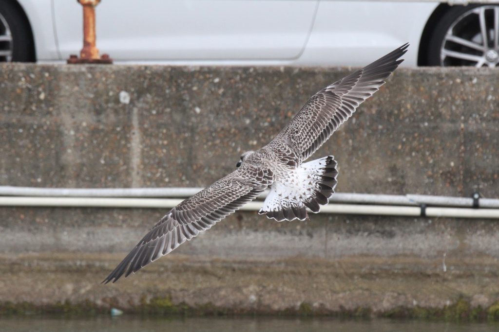 Very dark individual (particularly noticeable on the greater coverts which have no piano key patterning) with a rather ‘open’ facial expression. All this might lead down the Lesser Black-backed route but it was too large, had a heavy bill with expansion at gonys, a nice YLGish tail pattern and a typical weak primary window.