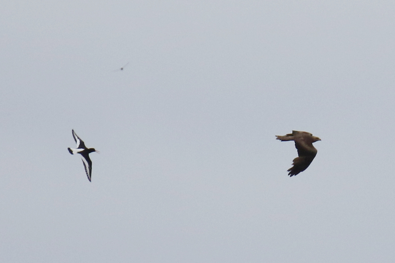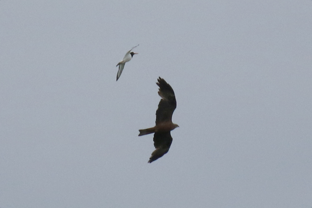 Pursued by an Oystercatcher it quickly moved off to the west where it joined three Red Kite circling over the ridge behind Carter’s Flood, before dropping out of site. Nice to clearly see its smaller wingspan in comparison to that species, which have been quite frequent locally this spring. There were a few reports from the Pett Level / Icklehsam area the next day and, based on matching a couple of broken primary feathers from photographs, this seems to be the same individual seen at Dungeness a few days later.