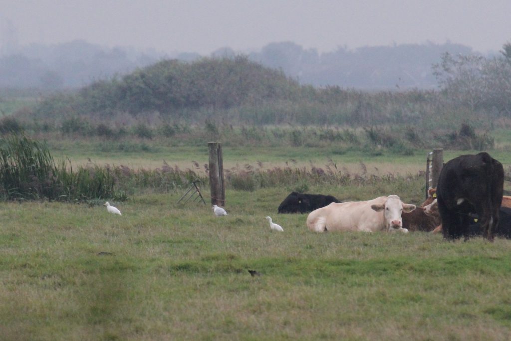 Two Cattle Egret (and a Herring Gull) with cattle near Toot Rock at Pett Level.