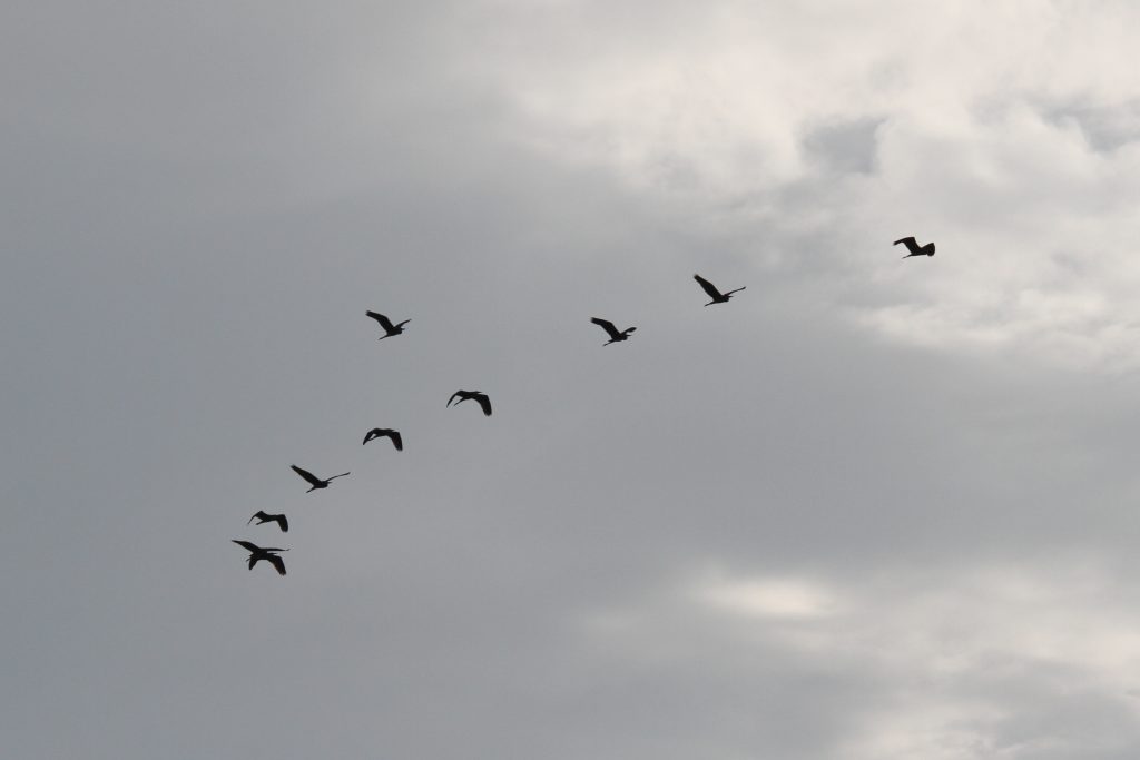 Flock of 10 Grey Heron flying over Hastings Country Park.