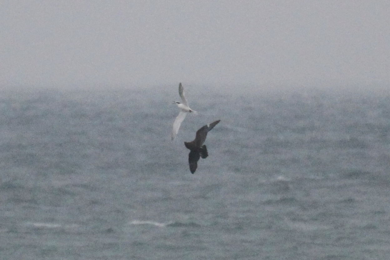 Arctic Skua harassing a Sandwich Tern for food offshore at Pett Level.
