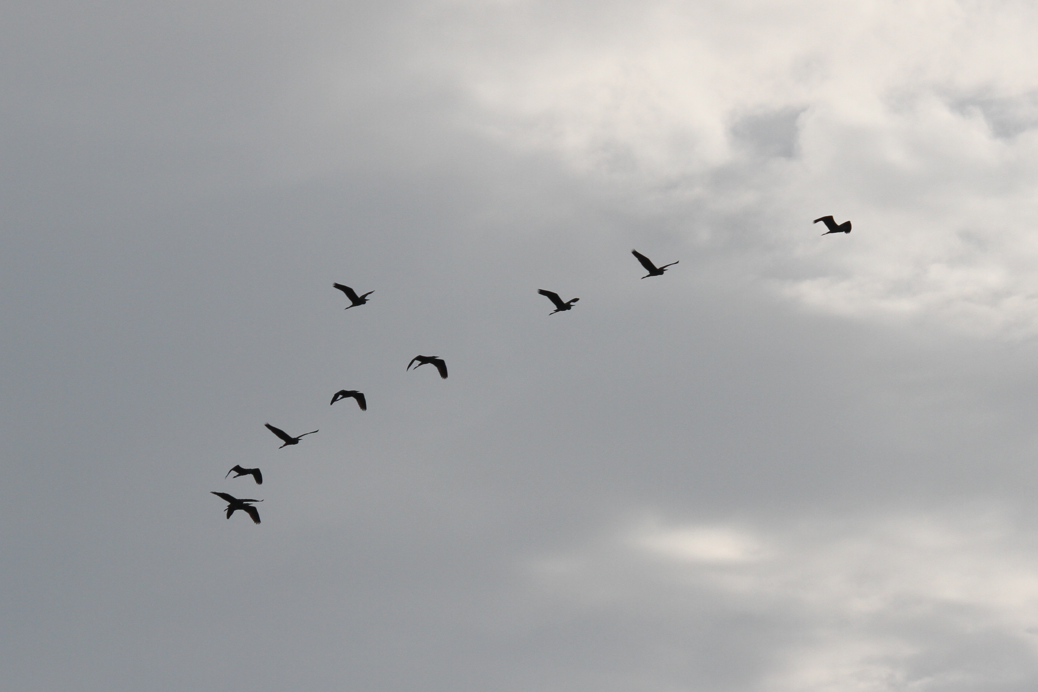 Flock of 10 Grey Heron flying over Hastings Country Park.