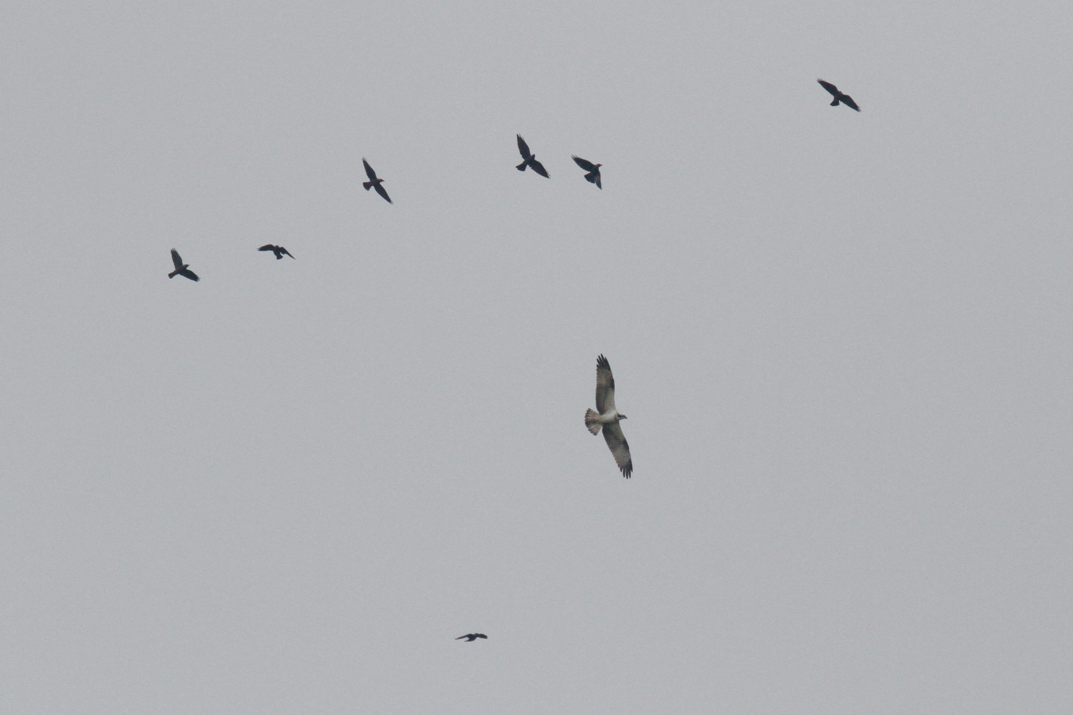 Osprey with Jackdaws in pursuit over Hastings Country Park.