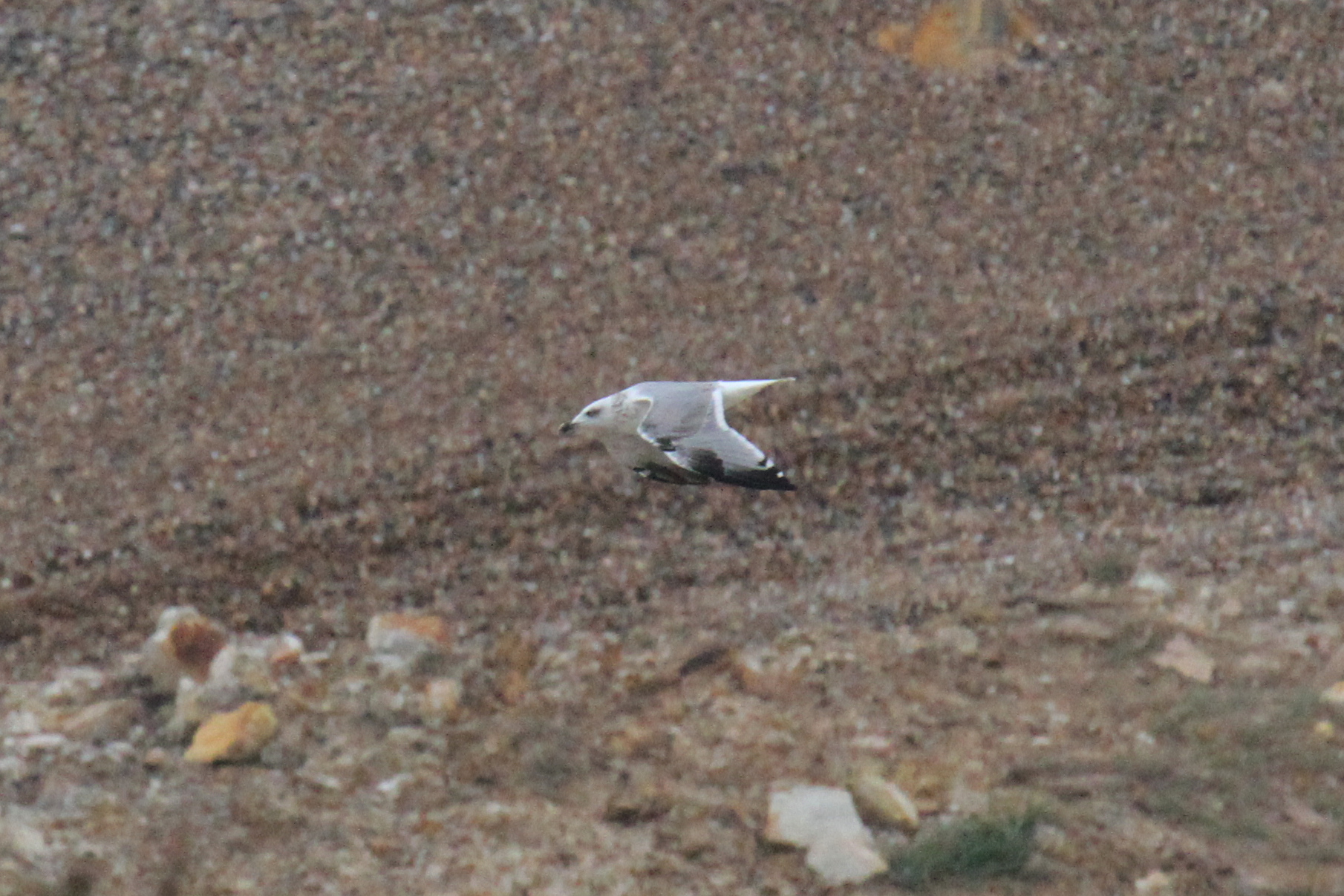 3CY Yellow-legged Gull flying along the cliffs, with lots of black on the primary coverts and a solid black band on P5.