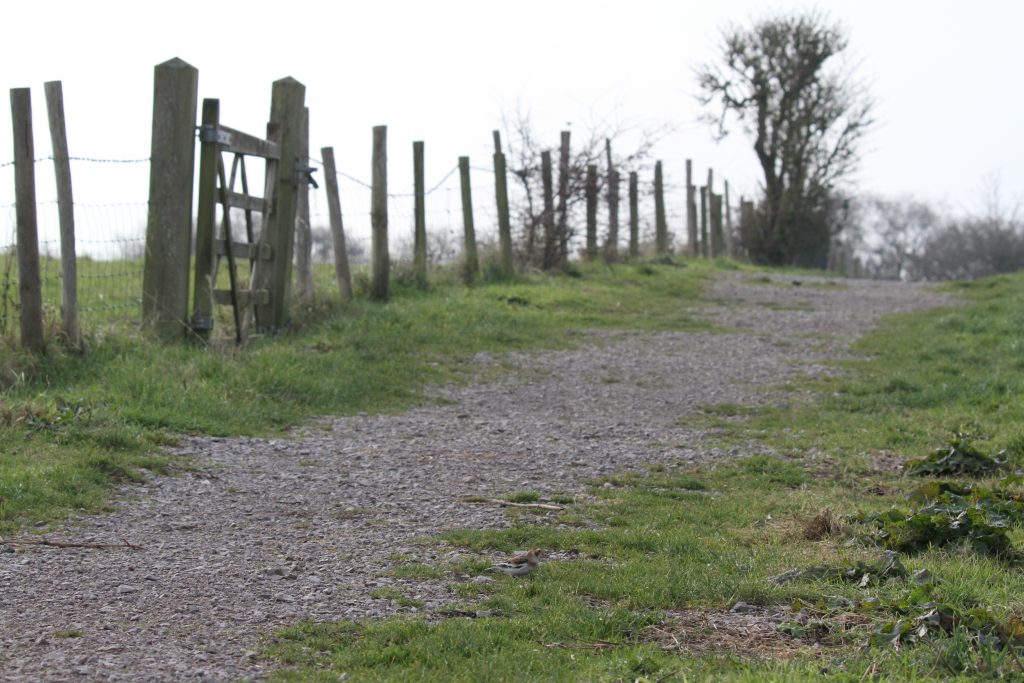 For the day it spent here, it seemed to stick religiously to the same small area of gravel track, despite it being on one of the main thoroughfares from the car park. I’m not sure what it was feeding on but I’m guessing remnants of grass seed lodged in the gravel, the track being positioned between two rough grass fields. It’s also a favoured site for Dunnocks which it was feeding alongside at times.