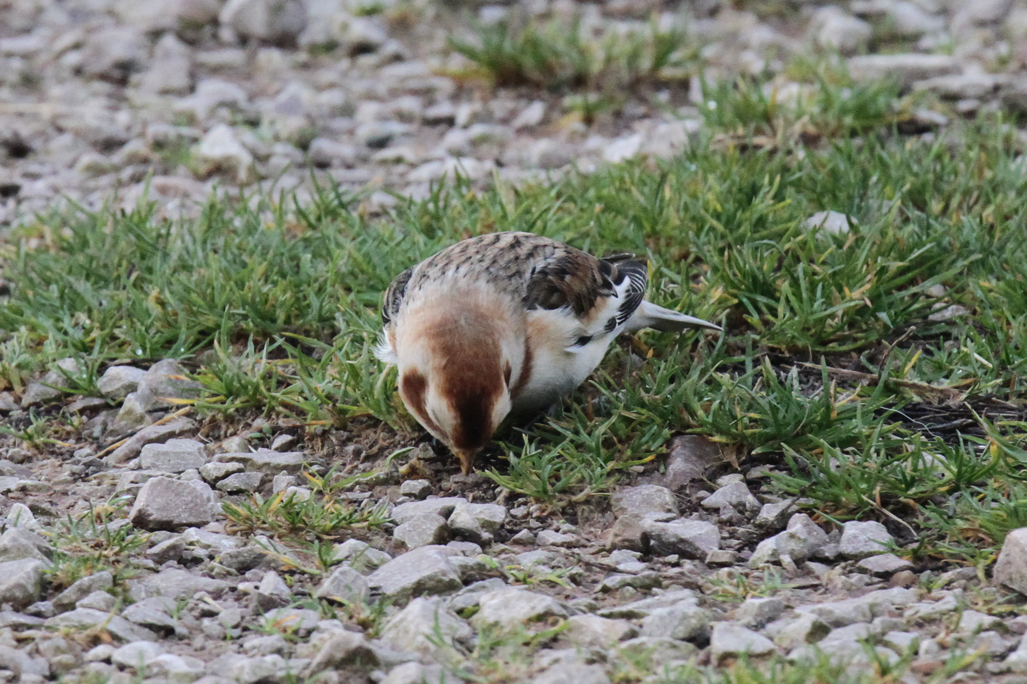 For the day it spent here, it seemed to stick religiously to the same small area of gravel track, despite it being on one of the main thoroughfares from the car park. I’m not sure what it was feeding on but I’m guessing remnants of grass seed lodged in the gravel, the track being positioned between two rough grass fields. It’s also a favoured site for Dunnocks which it was feeding alongside at times.