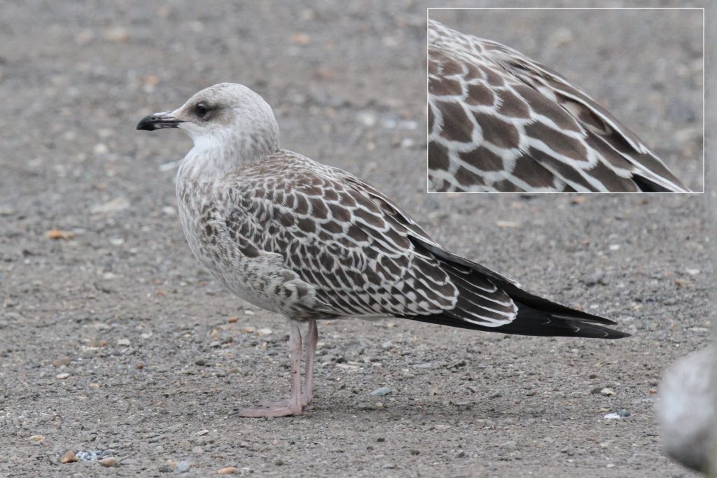 This bird was small with an attenuated shape, weak bill and short legs, all of which which suggest LBBG. The scapulars are quite neat and the tertials have long pale edges, also pro-LBBG. However, the tail pattern, primary window and overall colouration suggest YLG. Furthermore, I noticed in one photo there’s what appears to be a 2nd gen scapular tucked away on the back with a bold YLG-like anchor pattern! Not something I’ve ever seen before but possibly just an aberrant 1st gen feather. The pale base to the bill is odd and not something I’ve seen in either species, although the 1997 Martin Garner article in British Birds says that YLG can “have a pale base to the lower mandible by the first autumn”.