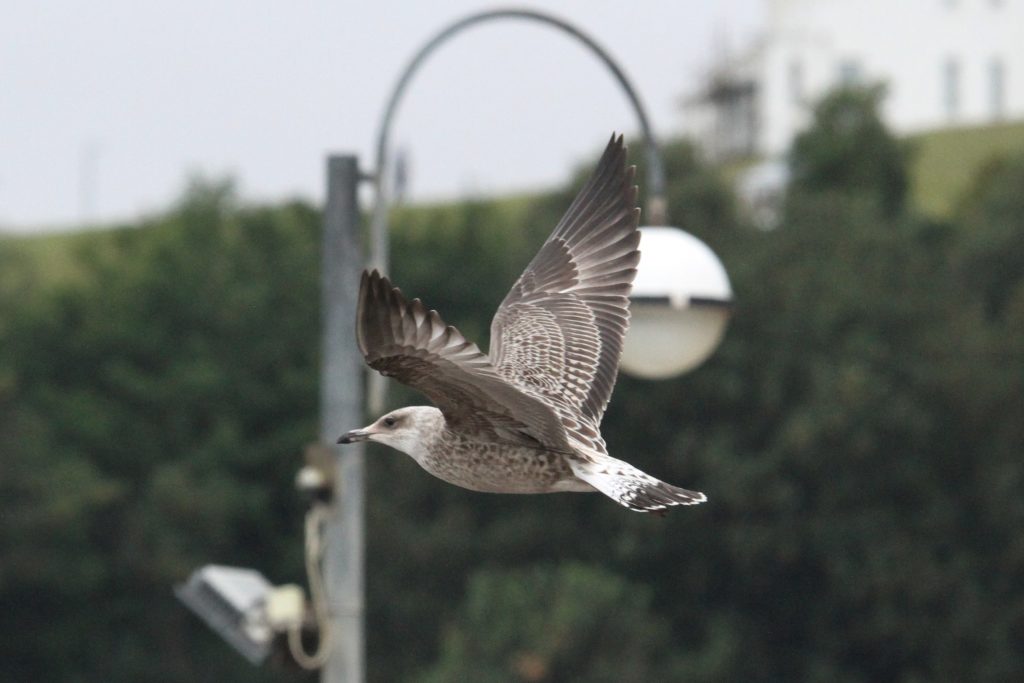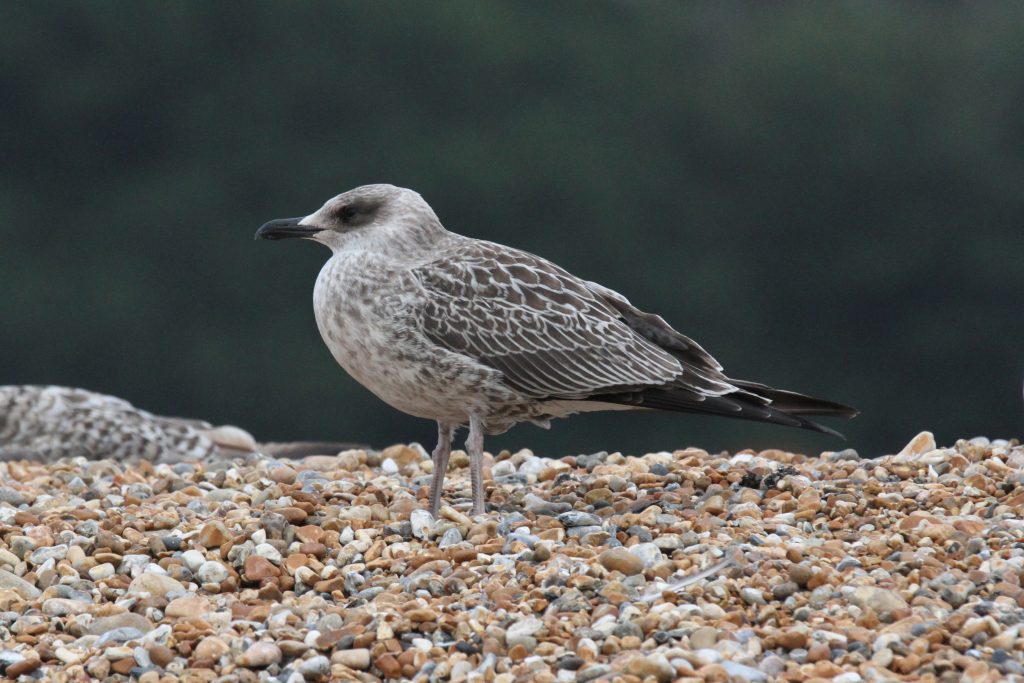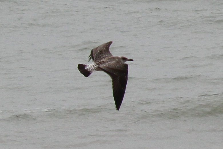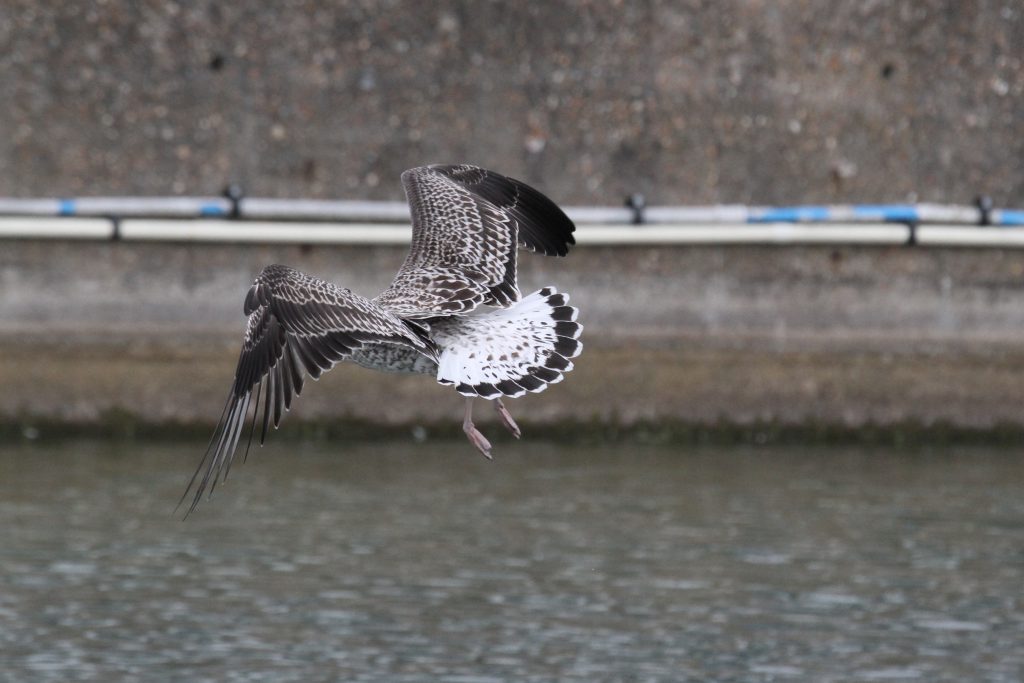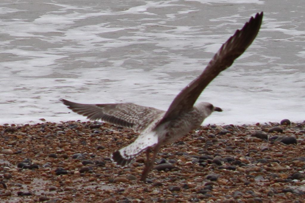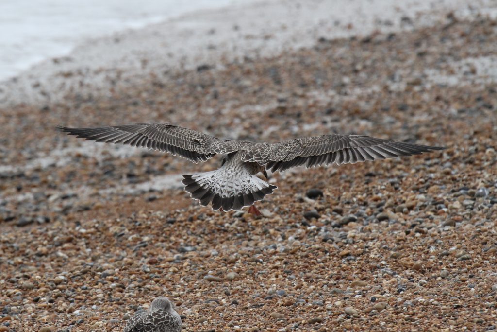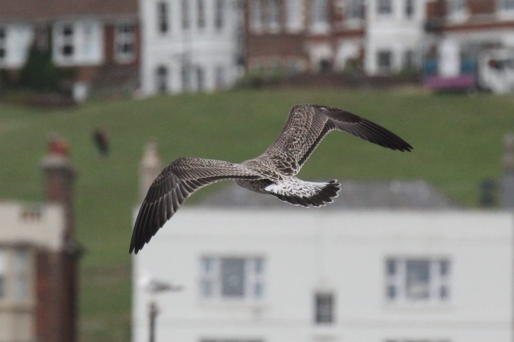 There were a couple of birds which presented characteristics that were intermediate between Yellow-legged Gull (YLG) and Lesser Black-backed Gull (LBBG). LBBG is a scarce breeder in East Sussex and I’m not aware of any pairs in the immediate Hastings area but, given gulls tendency to wander, it is possible that early fledging LBBG from elsewhere could show up. Digging into the research further I came across a ringing study where a first-year LBBG from Ireland had reached the Iberian peninsula by mid-July! And in fact I did see two juvenile LBBG on the 11th, both of which I only caught in flight — photos below. Both showed thick black tail bands without tapering at the edges, heavily mottled white tail base, dark inner primaries and smoky head patterns.
