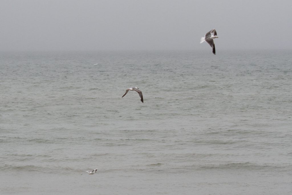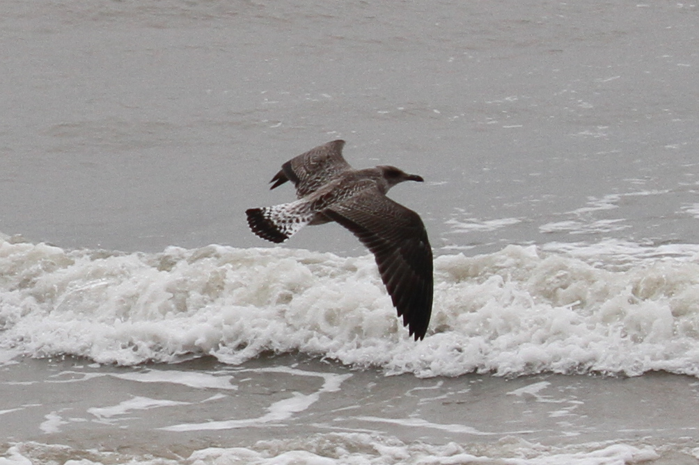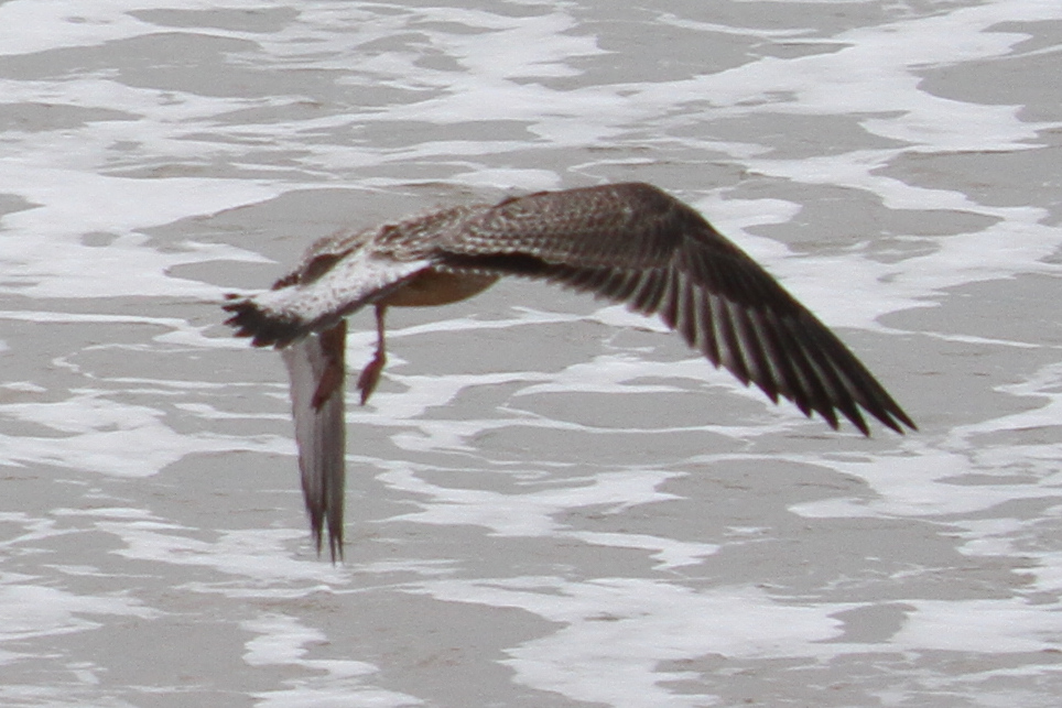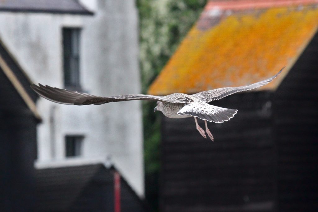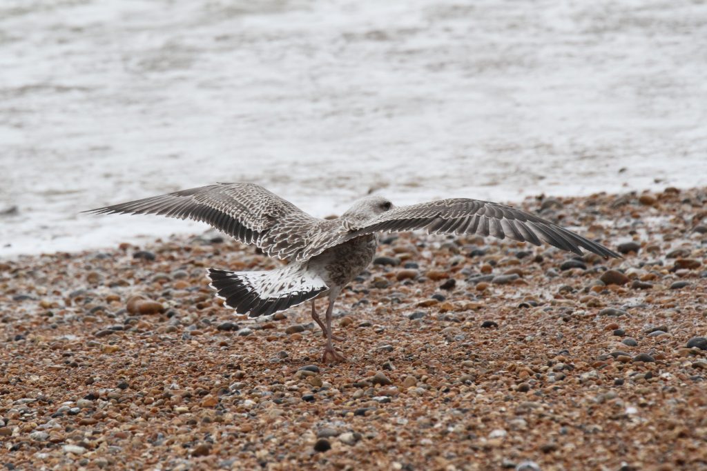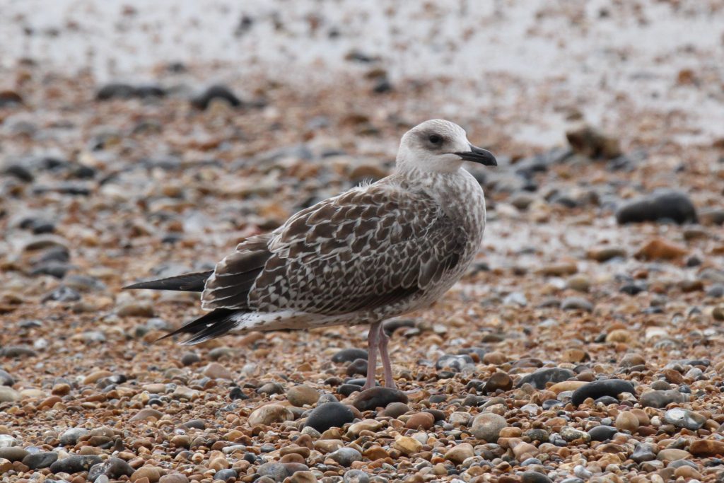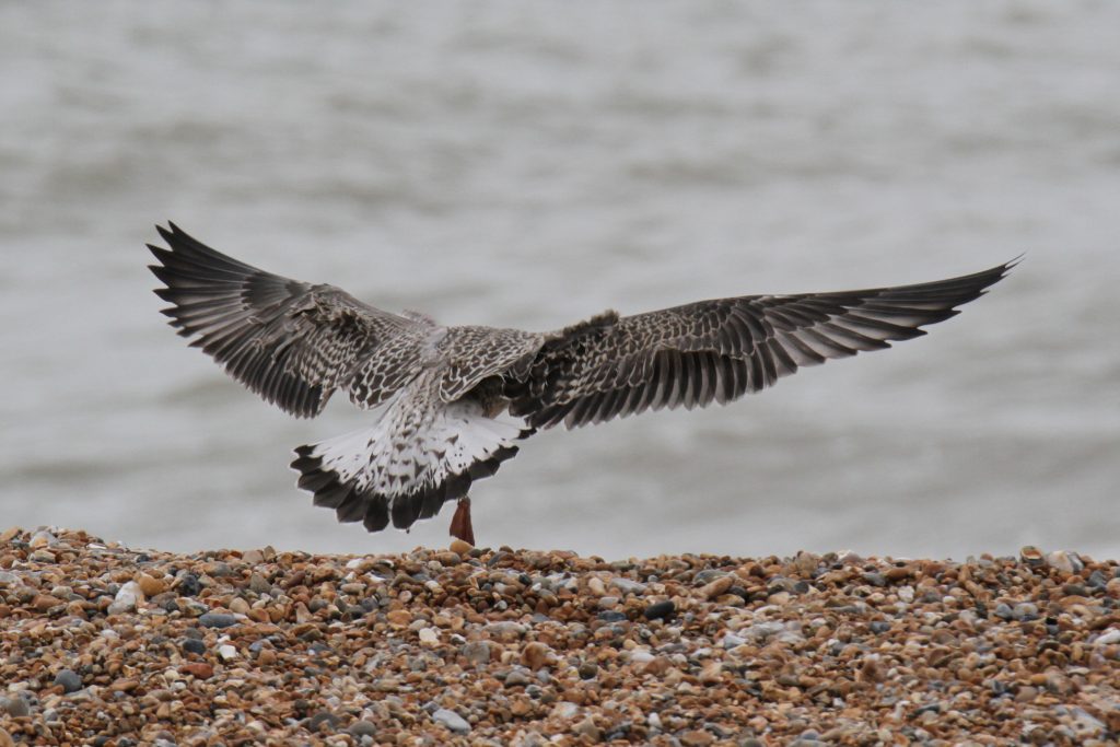 There were a couple of birds which presented characteristics that were intermediate between Yellow-legged Gull (YLG) and Lesser Black-backed Gull (LBBG). LBBG is a scarce breeder in East Sussex and I’m not aware of any pairs in the immediate Hastings area but, given gulls tendency to wander, it is possible that early fledging LBBG from elsewhere could show up. Digging into the research further I came across a ringing study where a first-year LBBG from Ireland had reached the Iberian peninsula by mid-July! And in fact I did see two juvenile LBBG on the 11th, both of which I only caught in flight — photos below. Both showed thick black tail bands without tapering at the edges, heavily mottled white tail base, dark inner primaries and smoky head patterns.
