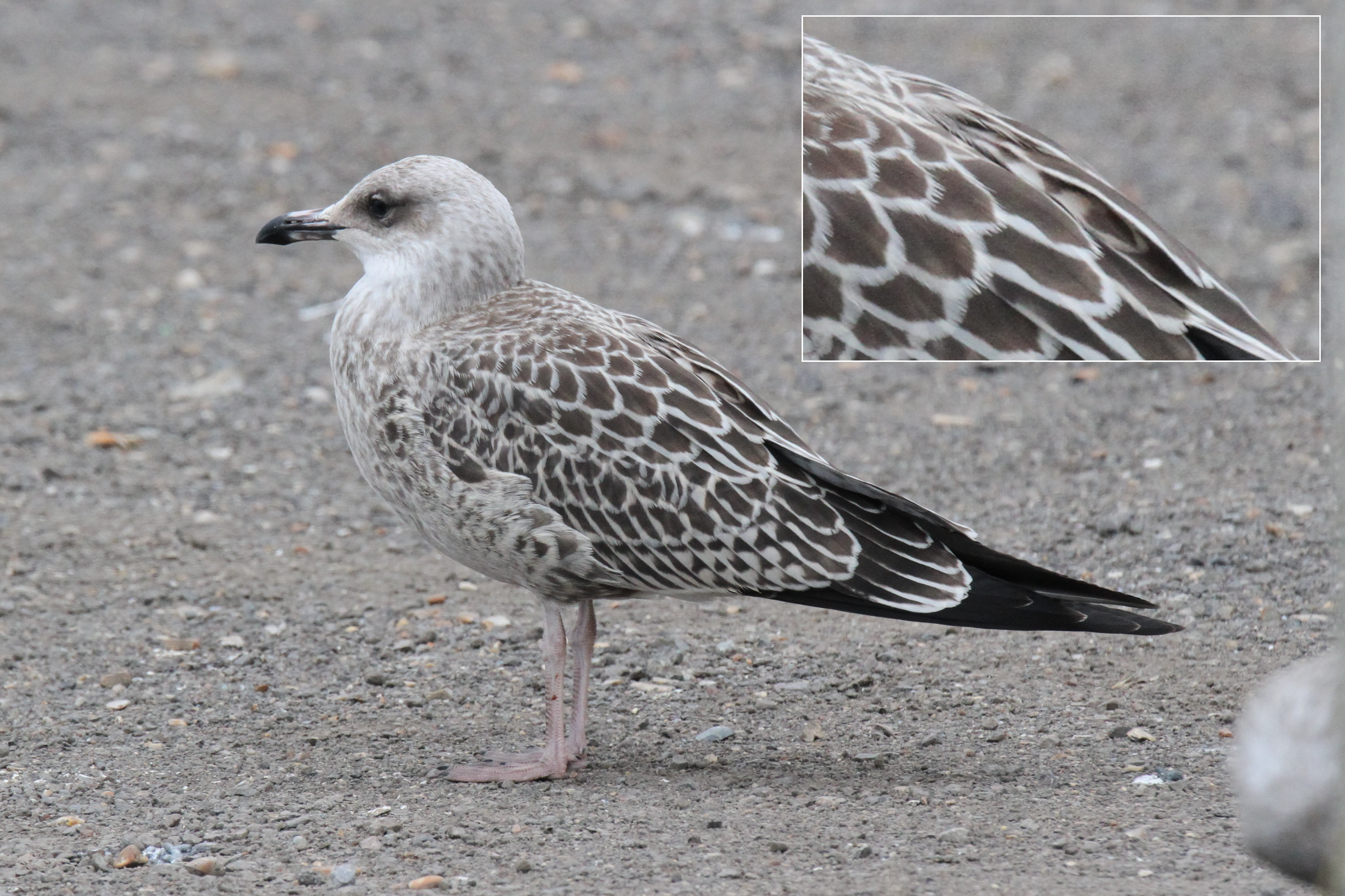 This bird was small with an attenuated shape, weak bill and short legs, all of which which suggest LBBG. The scapulars are quite neat and the tertials have long pale edges, also pro-LBBG. However, the tail pattern, primary window and overall colouration suggest YLG. Furthermore, I noticed in one photo there’s what appears to be a 2nd gen scapular tucked away on the back with a bold YLG-like anchor pattern! Not something I’ve ever seen before but possibly just an aberrant 1st gen feather. The pale base to the bill is odd and not something I’ve seen in either species, although the 1997 Martin Garner article in British Birds says that YLG can “have a pale base to the lower mandible by the first autumn”.