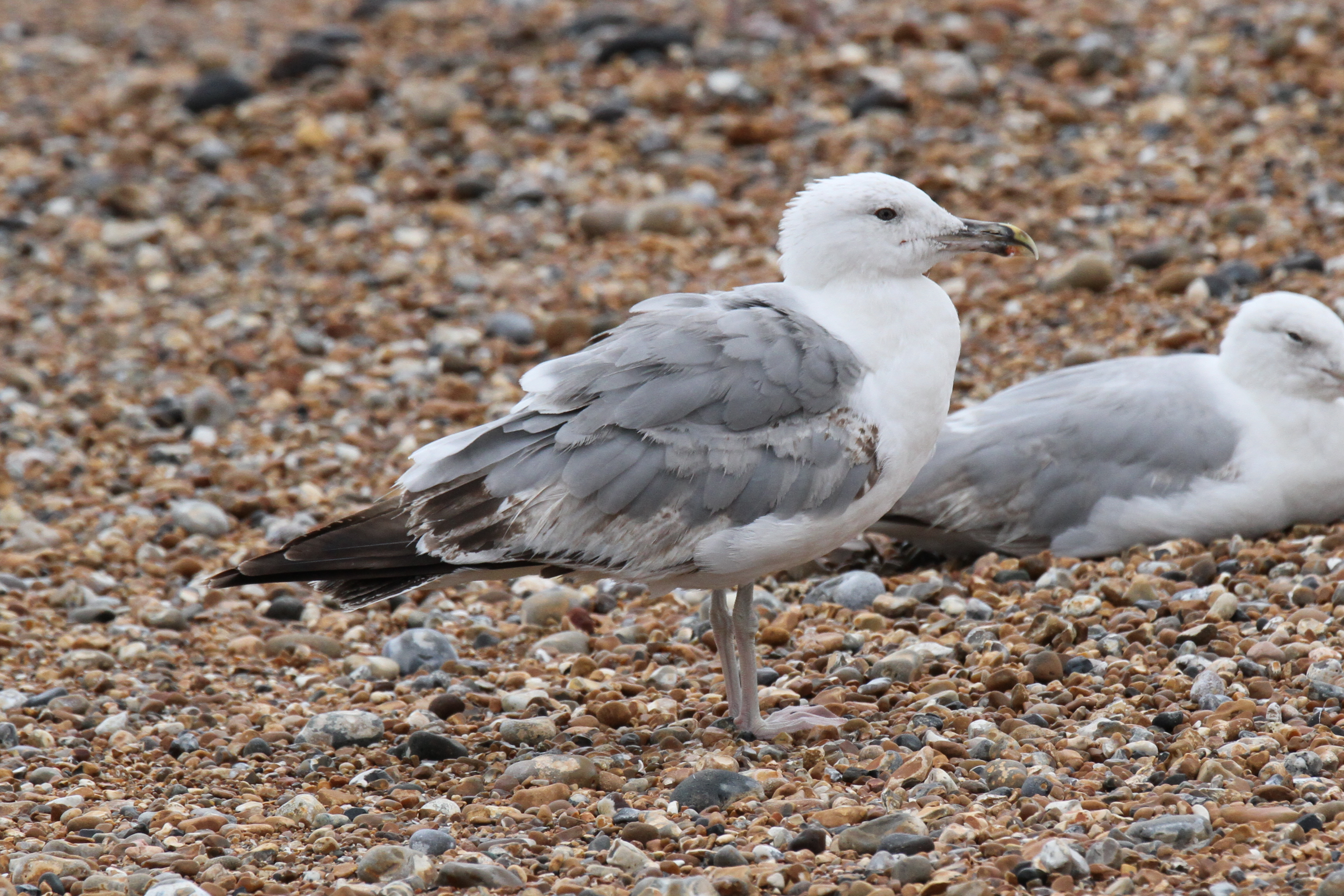 The second was a striking 3CY with dark irises and a blood red orbital ring and gape. The bill is in moult while the legs are still pinkish with a hint of yellow starting to come through. The classic solid dark tertials are showing but the wing feathers are a relatively light shade of grey for YLG, as you can see in the comparison with the sub-adult below. Still noticeably darker than 3CY Herrings nearby, which is a bit clearer in the flight shots. I’ve read that eastern YLG can be a lighter grey or maybe it’s just an age thing and the next generation of feathers will be darker.