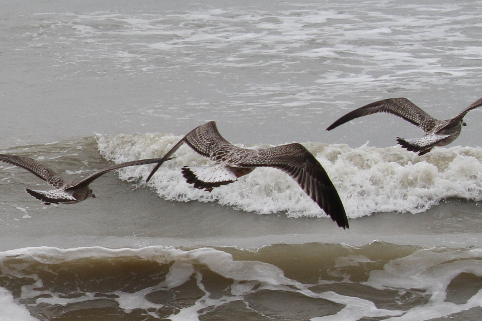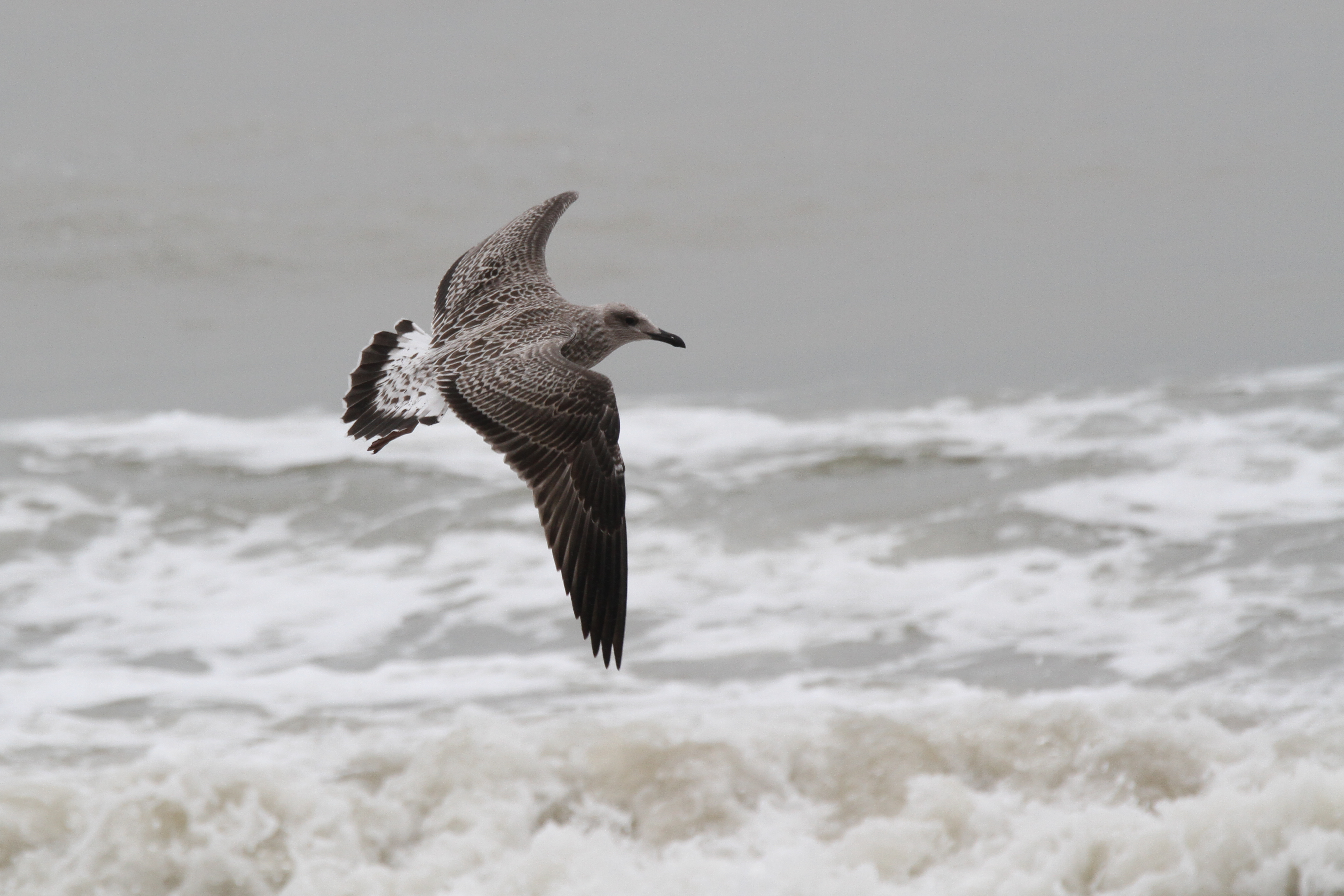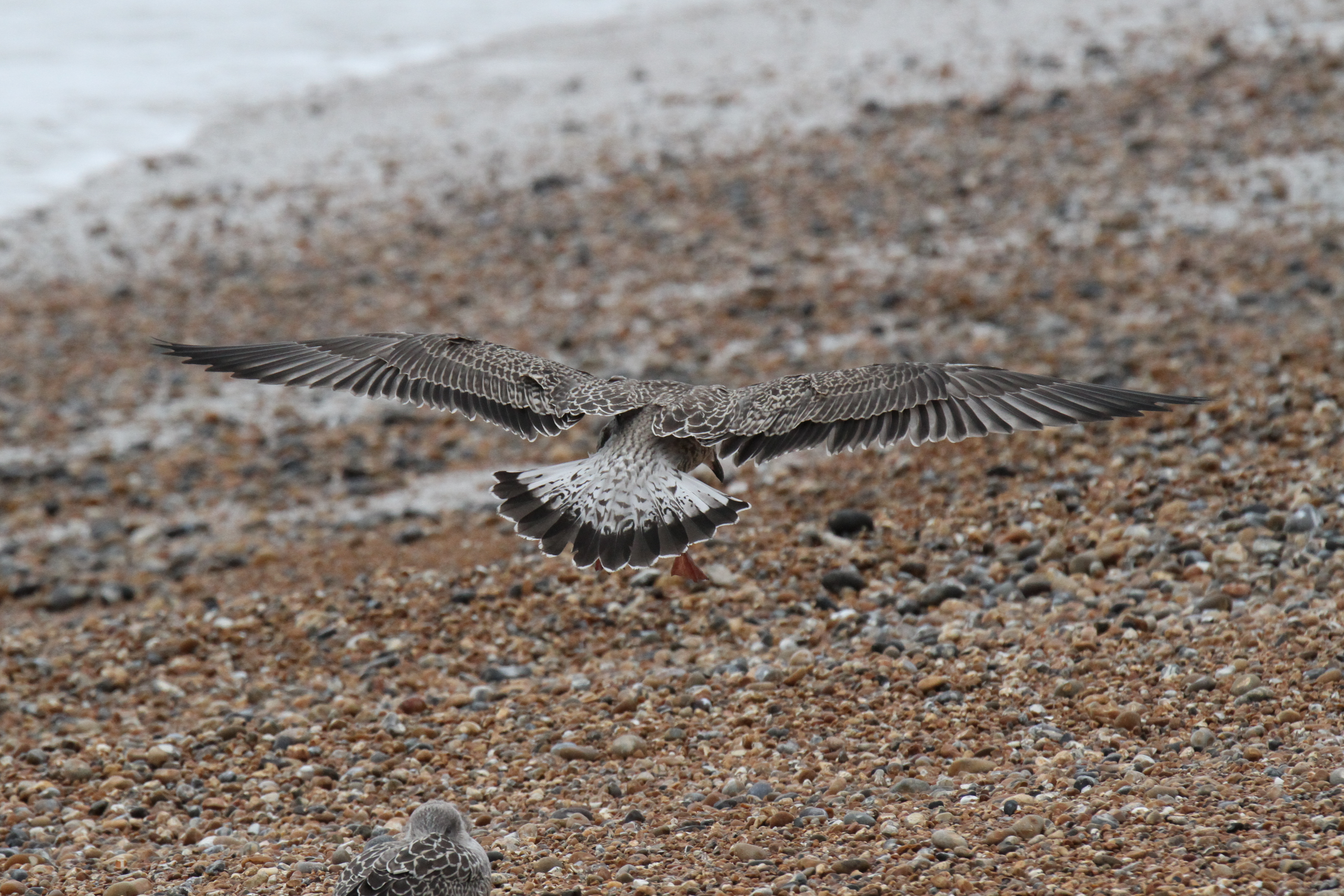 There were a couple of birds which presented characteristics that were intermediate between Yellow-legged Gull (YLG) and Lesser Black-backed Gull (LBBG). LBBG is a scarce breeder in East Sussex and I’m not aware of any pairs in the immediate Hastings area but, given gulls tendency to wander, it is possible that early fledging LBBG from elsewhere could show up. Digging into the research further I came across a ringing study where a first-year LBBG from Ireland had reached the Iberian peninsula by mid-July! And in fact I did see two juvenile LBBG on the 11th, both of which I only caught in flight — photos below. Both showed thick black tail bands without tapering at the edges, heavily mottled white tail base, dark inner primaries and smoky head patterns.